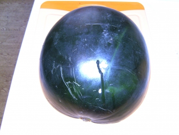Als erstes wird die Wassermelone vollständig geschält. Das weiße muß aber dran bleiben. Unten wird ein Stück abgeschnitten damit die Melone nicht wegrollt.