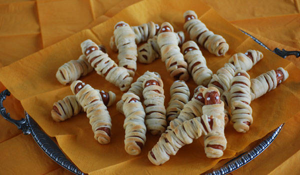 Den Pizzateig ausrollen und ihn in 0,5-1cm breite Bahnen schneiden. Die Würstchen je nach Länge in der Hälfte durchschneiden und den Teig um das Würstchen herum wickeln. Hierbei am besten an der geschlossenen Seite des Würstchens beginnen und darauf achten, dass der Teig einen festen "Hut" bildet. Den Teig nun in quer verlaufenden Bahnen um das Würstchen wickeln. Bedenke, dass noch Platz für die Augen benötigt wird. Hier also eine kleine Lücke lassen. Die Mumien-Würstchen auf ein Backblech legen (Backpapier nicht vergessen) und das Blech in den Ofen schieben. Der Ofen sollte hierzu auf ca. 180 Grad vorgeheizt und auf Ober-Unterhitze eingestellt sein. Sobald der Teig eine goldbraune Färbung erhält, die Mumien aus ihrem heißen Grab holen. Nun mit Kuchenglasur ein paar Augen auf jede Mumie malen. Die Süße der Glasur ist kaum zu bemerken und die Mumien-Würstchen behalten Ihren herzhaften Geschmack.